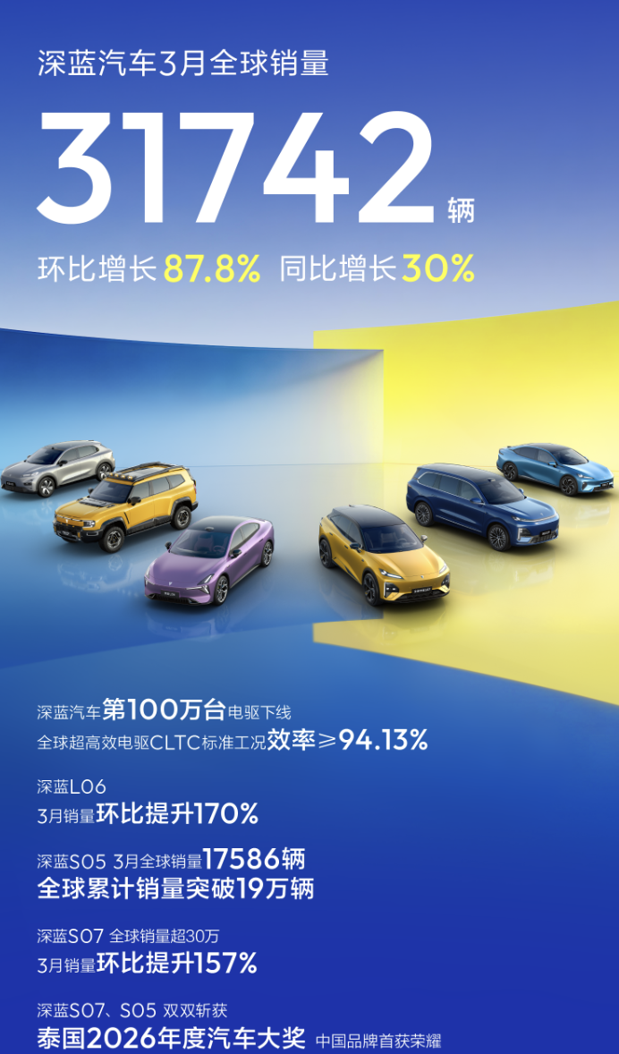 日前,深蓝汽车发布2026年3月全球销量数据,总销量达31742辆,同比增长30%,环比激增87.8%。其中,深蓝S05表现亮眼,不仅上市以来月均销量稳定破万,3月销量更是达到17586辆,全球累计销量已超19万辆;深蓝S07销量也实现逆势上扬,3月销量环比提升157%续父开了续女包小说txt,全球累计销量突破30万辆;深蓝L06同样表现不俗,3月销量达5135辆,环比增幅达170%,成为增长新引擎。此外,深蓝S09后驱Ultra超长续航版(25.99 万元)与深蓝 G318四驱旷野版(18.59 万元)迎来双车上新,进一步丰富了产品矩阵,满足不同用户需求。